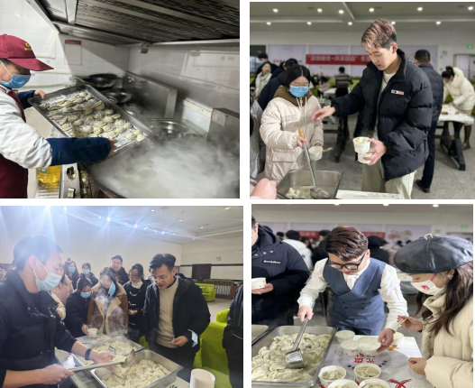 学生们将热气腾腾的饺子打包了一部分送给食堂的工作人员,还为宿管阿姨们也带去一份。来自新疆的2023级电子商务专业的杨乐乐同学说,“在北方大家都说饺子形状似耳朵,在冬至吃饺子寓意耳朵不会被冻掉,那我今年不会冻耳朵啦。”今天在现场包饺子对他来说,有一种回“家”的感觉。