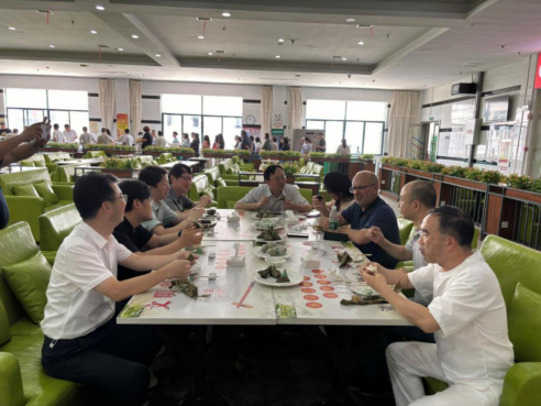 在关山校区食堂三楼,后勤服务集团党政主要负责人与各学院教师(含外籍老师)和毕业生代表一起填糯米、放蜜枣、裹粽叶、系马莲,同场竞技,各显身手,体验传统习俗,品味端午文化,共叙师生情谊,共迎端午佳节。