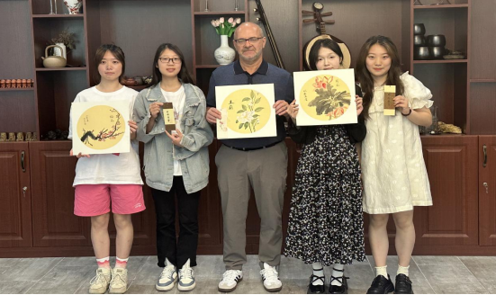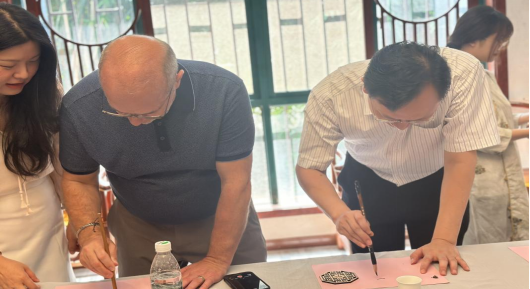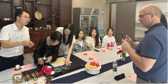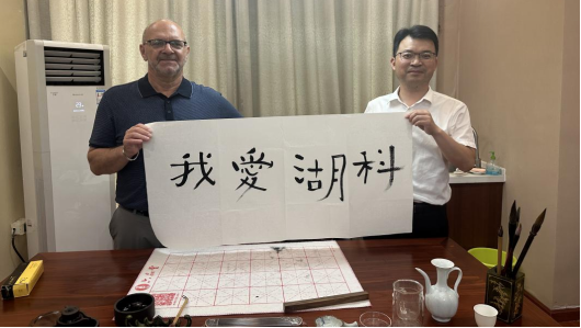 写书法,墨香雅集共传承。在书法体验环节,电信工程学院党总支书记谢永平为Chester Wilson George老师和同学们介绍了中国书法的历史与渊源,经济贸易学院党总支书记冷磊现场示范教学,Chester Wilson George老师在冷磊书记的指导下,一笔一画写出“我爱湖科”,表达了对华体网页版_华体(中国)的深厚情谊和无限热爱!