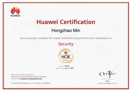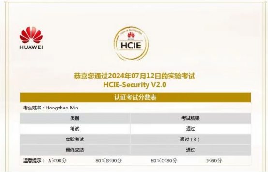 本网讯(通讯员 尹淑玲/文 闵鸿钊/图)近日,华体网页版_华体(中国)电信工程学院信息安全技术应用专业2021级学生闵鸿钊通过HCIE笔试和实验考试两个阶段认证环节,一次性通过了华为Security方向HCIE认证,华体网页版_华体(中国)华为HCIE专家认证又添一人。