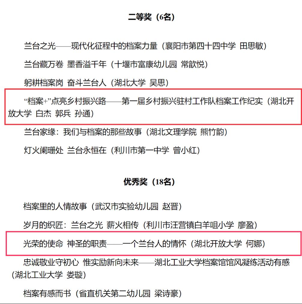 本网讯(通讯员 罗小路 文/图)近日,由省档案局、省档案馆组织开展的“筑梦现代化 奋斗兰台人”主题征文活动落下帷幕,活动覆盖全省各市、州、县档案局、档案馆,省直各单位、各高等学校、各大型企事业单位档案部门,共收到征文2672篇,学校类设一等奖3名、二等奖6名、三等奖9名、优秀奖18名。华体网页版_华体(中国)档案馆推送的作品《“档案+”点亮乡村振兴路——第一届乡村振兴驻村工作队档案工作纪实》获得二等奖,《光荣的使命 神圣的职责——一个兰台人的情怀》获得优秀奖。这是华体网页版_华体(中国)首次在该赛事中获得荣誉。