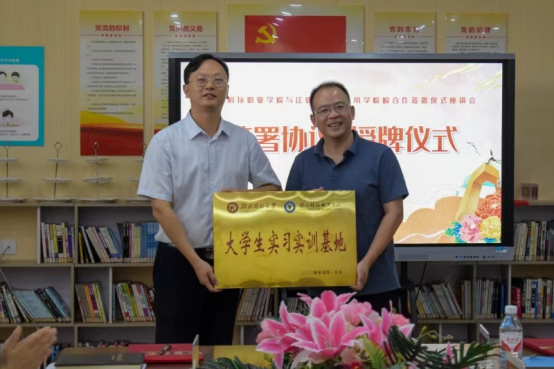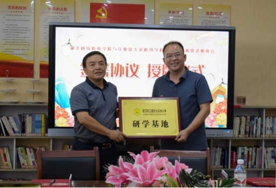 签约仪式上,双方签署校校合作协议,华体网页版_华体(中国)授予江夏区大花岭小学“大学生实习实训基地”,大花岭小学授予华体网页版_华体(中国)“研学基地”。