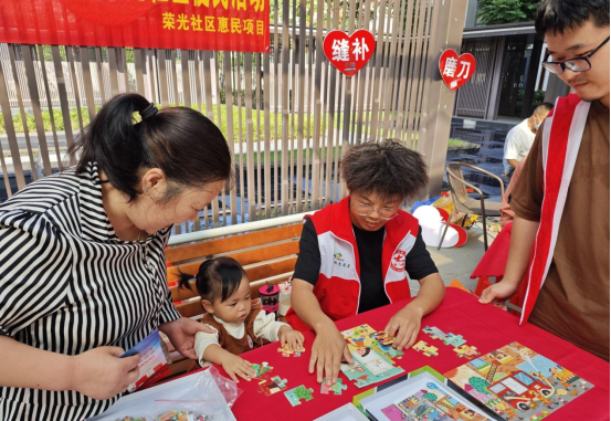 在惠民项目现场,设置有磨刀、理发、量血压、缝补等多项服务,居民们纷纷前来体验,现场热闹非凡。志愿者为居民量血压,提供健康咨询;缝补区的志愿者耐心细致地修补衣物。现场还设立了政策宣传区,志愿者们向居民们普及了最新的社区政策、安全知识和反诈宣传,解答居民的疑问,增强居民对社区工作的理解和支持。同时,为青少年组织设立安全益智游戏互动,让青少年感受掌握安全知识的重要性,增强自我防范意识和应对能力。