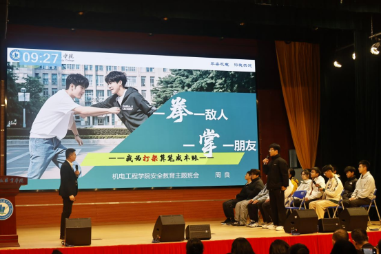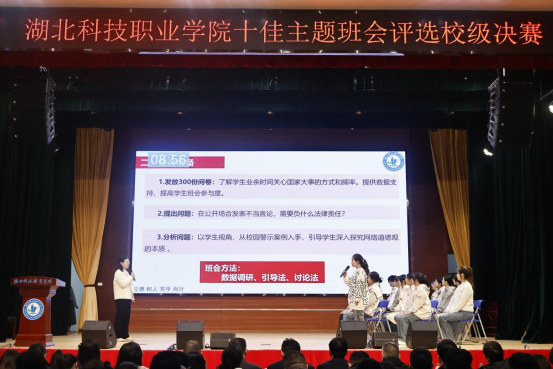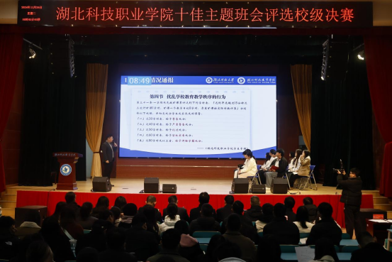 本届十佳主题班会评选活动自11月7日启动,经各二级学院初赛选拔推荐,共有10名辅导员进入校级决赛。校级决赛通过场景再现的方式,展示辅导员组织召开主题班会的主要过程。决赛现场气氛热烈,各位选手根据命题式场景抽题,聚焦学生工作中的热点、痛点、难点,赛场“练兵”分析问题、研判问题、解决问题,利用短视频、案例分析、互动问答等丰富的展现形式,以小切口引入育人大道理,呈现了一堂堂主题鲜明、构思巧妙、内容丰富、寓意深刻的主题班会,博得了现场观赛老师的阵阵掌声,充分展现了学校辅导员队伍扎实的专业素养和良好的精神风貌。