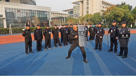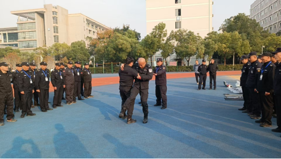 武汉市公安局特警支队许凯警官结合当前社会发生的极端案例和校园安全工作的特点,向队员讲解了门禁管理、校园巡逻等工作任务以及工作中的关注事项,介绍了应对突发事件的措施和方法。在技能培训环节,许凯和特警队员现场讲解示范格斗擒拿技巧要领,演示钢叉、盾牌、警棍等常用器械的正确使用方法,模拟突发事件中三人攻防小组和五人攻防小组的队形演练以及多人攻防配合技能和器械组合使用方法。校卫队队员全程参加,切实感受现场处置要领,有效提升了他们在应对突发事件时的快速反应和实际操作能力,提高了学校安保队伍的综合业务素质。
