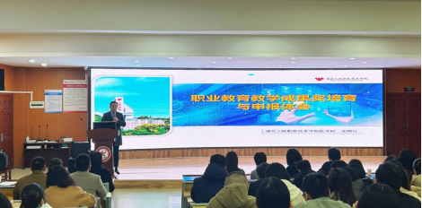 国家级职业教育教学成果奖一等奖获得者、国家级教学名师湖北三峡职业技术学院沈曙红教授作“职业教育教学成果奖培育与申报体会”专题培训。他结合自身多年来在教育教学改革研究和教学成果奖申报方面的经验,围绕职业教育教学成果奖的理论基础、实践研究与提升、培育和申报等方面展开翔实而细致的阐述。他表示,成功申报教学成果奖必须杜绝急功近利的心态,聚焦职业教育改革热点问题,结合已有的工作和研究成果,突出学校教育教学的特色和优势。沈曙红以其严谨的思路分析、生动的案例讲述、幽默的表达方式,引得现场掌声不断。