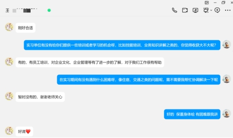 工商管理学院充分发挥“导师制”平台作用,每位教师对自己所带的导师制里的学生开展一对一帮扶。教师们通过一对一谈话、集中座谈等多种方式,多层面深入了解学生的学业压力、就业困境、心理状况,制定个性化的帮扶方案。针对大三校外实习学生,指导老师们建立了线上线下关怀以及常态化的沟通机制,确保学生在岗位实习过程中得到及时的指导和关怀。