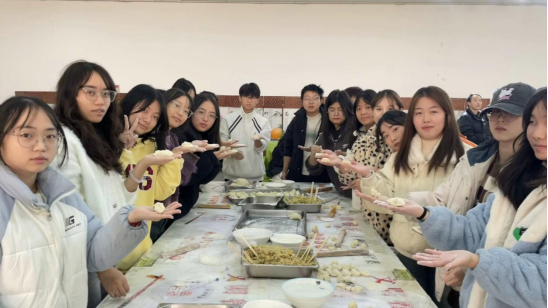 下午3点,师生们在活动场地开始忙碌起来。面团在手下逐渐延展,擀成一张张中间稍厚、边缘稍薄的饺子皮,再将和好的肉馅包入,小巧精致的饺子便呈现在眼前。经过一个多小时的努力,有宛如新月的月牙饺,有饱满圆润的元宝饺,甚至还有圆圆胖胖的小包子,场面一片欢腾。在创意拼盘环节,大家涌现出一个个美观又巧思的作品,如“冬至”“快乐”“12·18”等;在冬至谚语比拼环节,大家积极参与,彰显出对传统文化的了解与传承,师生感情也在手工与协作中交融。