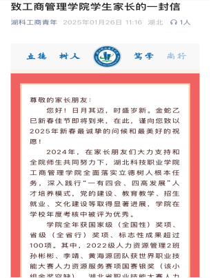 寒假期间党总支书记熊振、院长苏枫给学院全体学生家长撰写一封信,这封饱含深情的家书,不仅送去了学院对家长的新春祝福,更表达了家校携手、共育英才的美好愿景。信中真诚地希望家长们能够与学院保持密切沟通,及时了解孩子的学习和生活情况,关注孩子的身心健康,加强安全教育,共同度过一个平安、快乐、充实的寒假。这封饱含温情的家书,在家长中引起了热烈反响。许多家长表示,看到信件感到十分惊喜和感动,信中真挚的语言和殷切的期望让他们感受到了学院对学生的关心和重视。他们纷纷表示,将积极配合学院的工作,与学校携手并肩,共同为孩子的成长保驾护航。