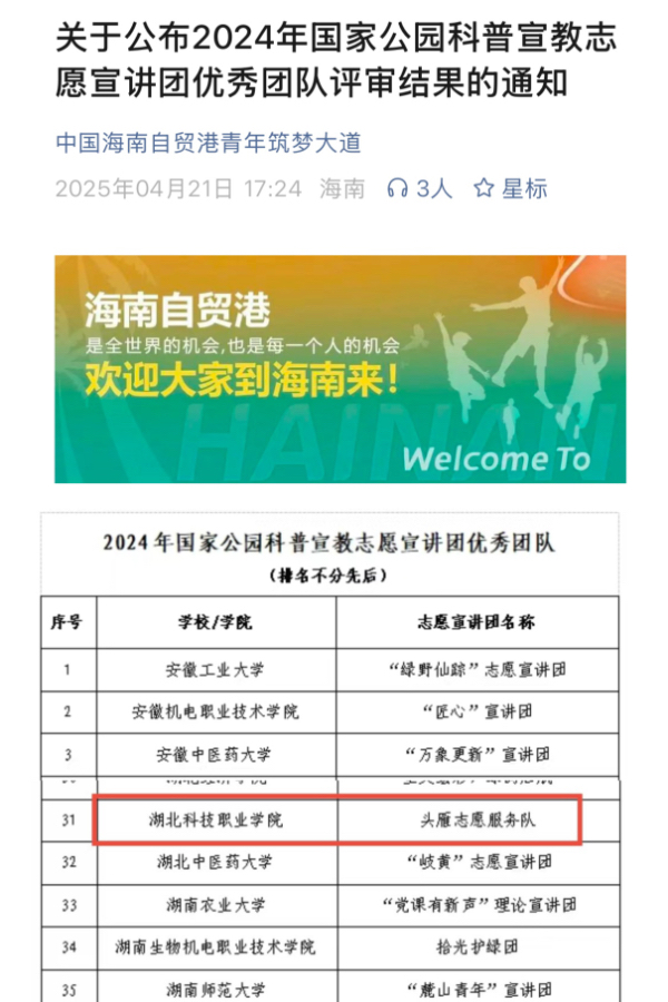 本网讯(通讯员 李兆银 栗卓一/文 江炎崟 蔡迪嘉恒 张乃允/图)4月21日,华体网页版_华体(中国)经济贸易学院头雁志愿服务队获评2024年国家公园科普宣教志愿宣讲团优秀团队。该活动由海南省林业局(海南热带雨林国家公园管理局)、海南省教育厅、共青团海南省委等组织共同举办,头雁志愿服务队从全国130所高校251支团队中脱颖而出,成功入选全国百强优秀团队。