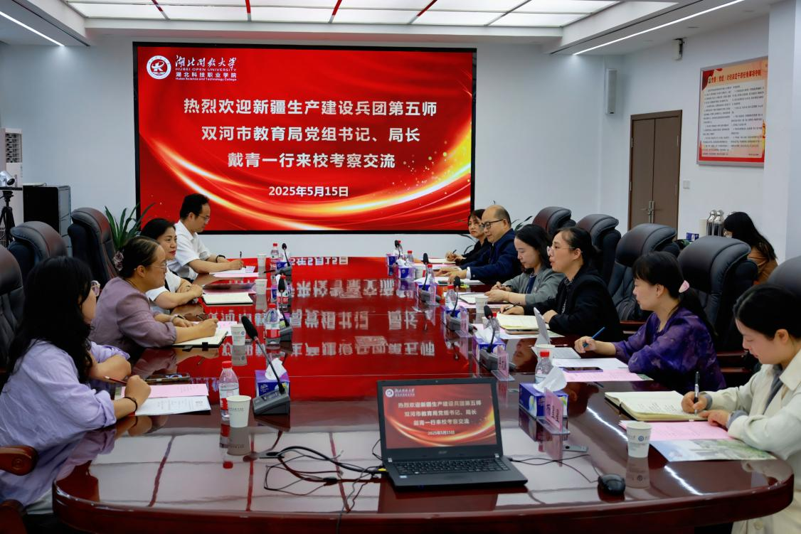 本网讯(通讯员 熊韵坚/文 周夏/图)5月15日下午,新疆生产建设兵团第五师双河市教育局党组书记、局长戴青,双河职业技术学院党委书记樊荣一行来校考察调研。校党委常委肖潇,学工部、教务处、人事处、工商管理学院负责人陪同调研并参加座谈交流。