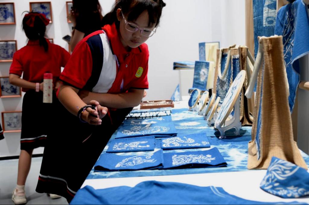 活动伊始,大花岭小学师生步入华体网页版_华体(中国)荆楚非遗文化职教传承研究中心,先进的数字技术将荆楚非遗以全新方式呈现:“非遗数字人”通过语音问答与大家展开交流;非遗蓝染展厅内,传统蓝染工艺与现代设计理念结合的作品,展现独特艺术魅力;AI智能化妆镜的互动体验,让孩子们异常兴奋。武汉剪纸大师工作室内,师生团队的精湛技艺令众人惊叹。展厅大屏播放着动漫专业学生制作的动画片,非遗空间营造了轻松活泼的氛围,让非遗以更贴近青少年的方式融入,全面体验传统文化魅力。