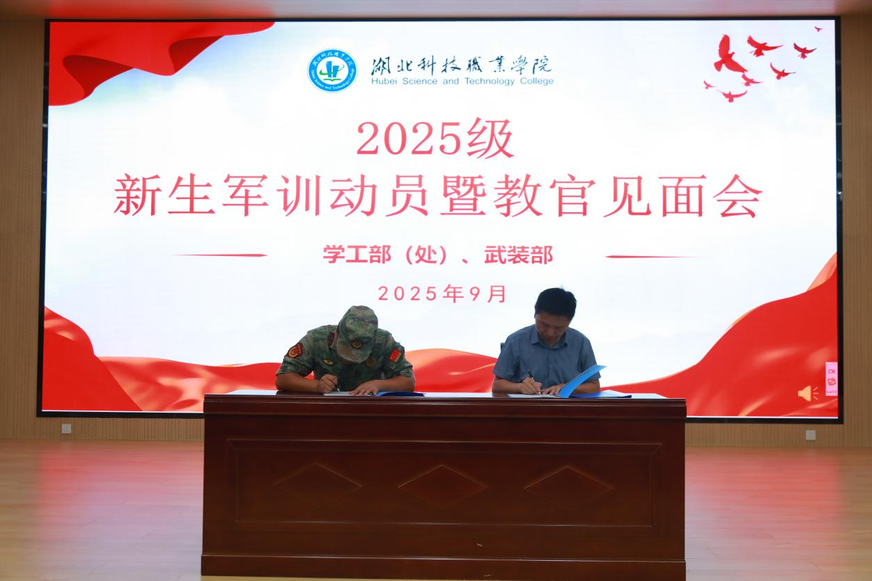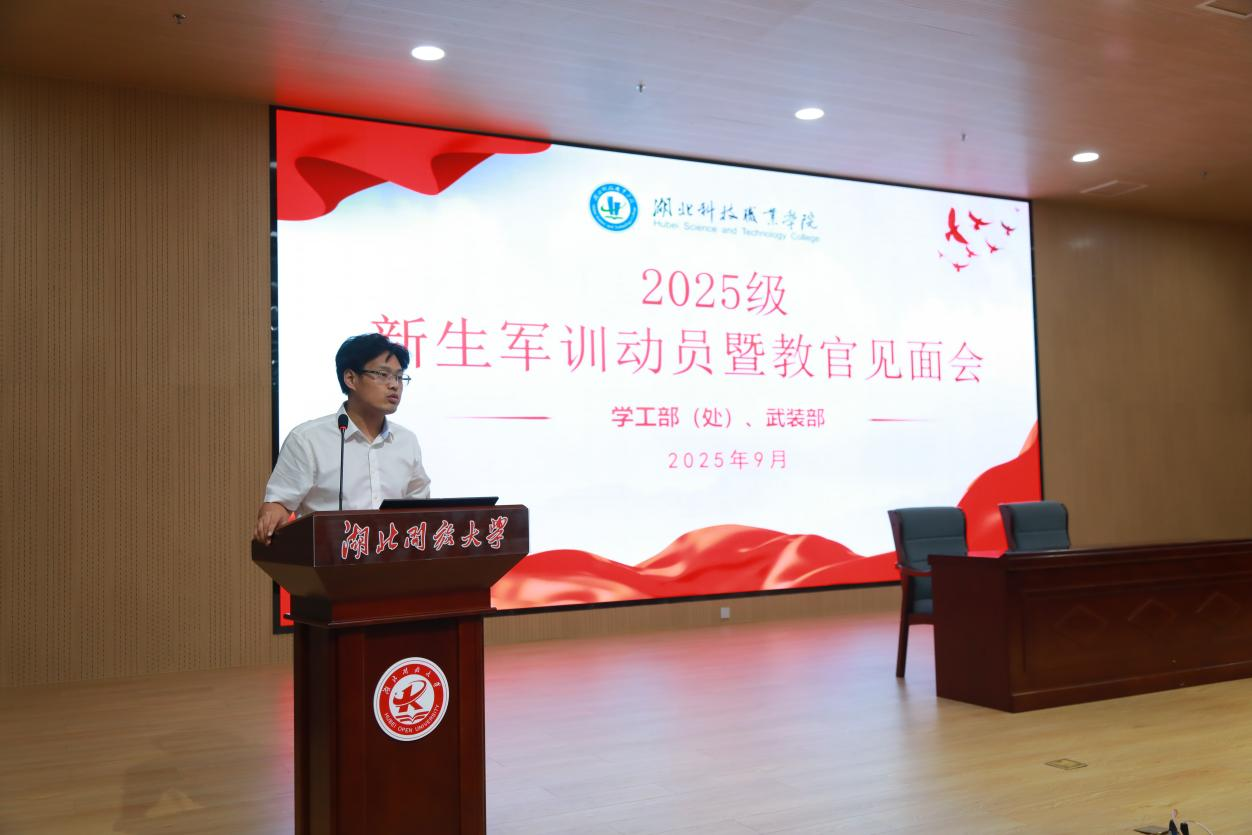 本网讯(通讯员 王吉/文 大学生记者:蔡迪嘉恒/图)9月13日下午,华体网页版_华体(中国)在关山校区综合实训楼报告厅举行2025级新生军训动员暨教官见面会。学工部(处)、武装部、团委负责人,蔡甸区武装部50名民兵教官,各学院学工办主任、全体新生辅导员和新生代表参加会议。