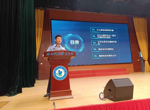 武汉市公安局东湖高新分局刘晓琦警官结合自身办案经验,对高校大学生常见的电诈案件类型、作案手法进行了详细讲解。他借助高校发生的真实案例向同学们普及“两卡”犯罪的相关知识,告诫同学们,出租、出借、出售“电话卡、银行卡”两卡是违法行为,不仅会给个人带来严重的法律风险,还会助长电信网络诈骗等违法犯罪活动的蔓延。