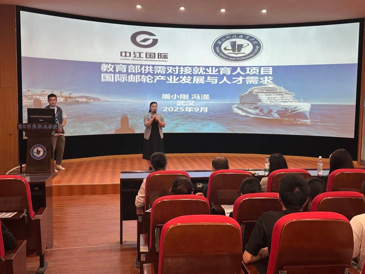 本网讯(通讯员:闫秦勤 文/图) 9月27日,学校工商管理学院国际邮轮乘务管理专业2023级实习动员会顺利召开。作为教育部供需对接就业育人项目的重要实践载体,本次活动同步迎来中国江苏国际经济技术合作集团有限公司(简称“中江国际集团”)的实习宣讲与现场面试,全国交通运输职业教育教学指导委员会委员、中江国际邮轮管理中心主任屠小刚,招聘经理冯湜来校开展实习宣讲。2023级国际邮轮乘务管理专业全体学生、武汉交通职业学院交通文旅学院师生跨校参与,共探邮轮人才培养与就业新路径。