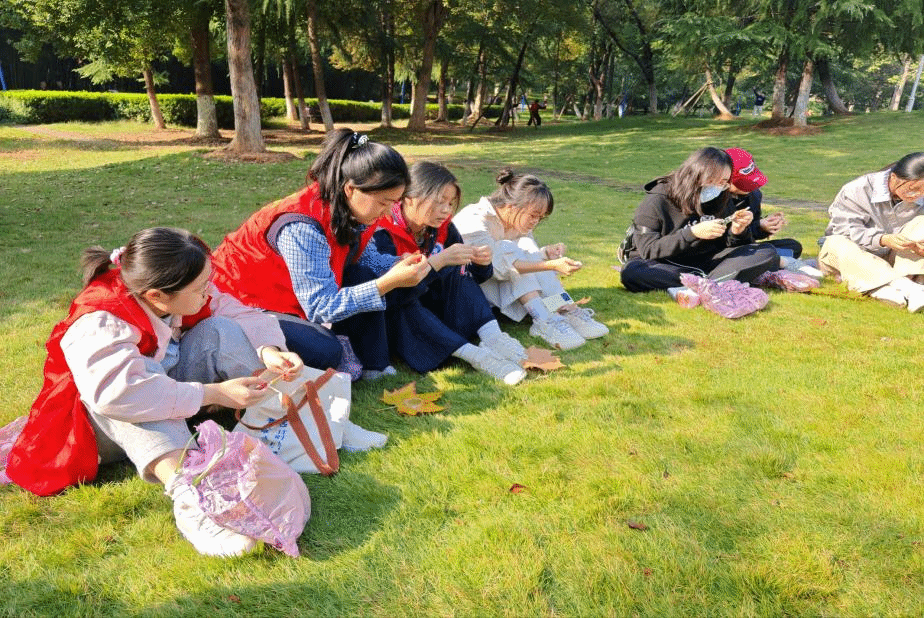 志愿者们围坐在绿意盎然的草坪上,有人拿着剪刀细细修剪梧桐叶的边缘,让不规则的叶片化作流畅的弧线;有人用胶水将红枫与银杏交错拼贴;还有人专注地为压制平整的叶片打孔穿绳,大家都沉浸在“变废为宝”的手工乐趣中。志愿者赵博雅一边认真穿绳,一边轻声说道:“我想把今天做的落叶吊坠留到明年亲手交给鹿头的小朋友,他们一定会很开心的。”这份用落叶传递环保与爱意的巧思,其实藏着一段关于鹿头镇的温暖回忆。暑期支教时,志愿者们曾在鹿头镇开设趣味自然课,带领孩子们捡拾当地落叶、花草并制作环保手抄报。当时孩子们对落叶环保手工的喜爱,让志愿者萌生了延续这份乐趣的想法。