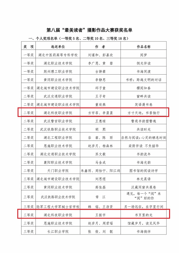 本网讯(通讯员 尹锦育 文/图)近日,湖北省高职高专院校第八届“最美读者”摄影作品大赛圆满落幕。华体网页版_华体(中国)方宇菲、李盈盈同学的作品《方寸天地,书香独行》荣获二等奖,王振宇同学的作品《书页里的光》荣获三等奖,学校获评“优秀组织奖”。