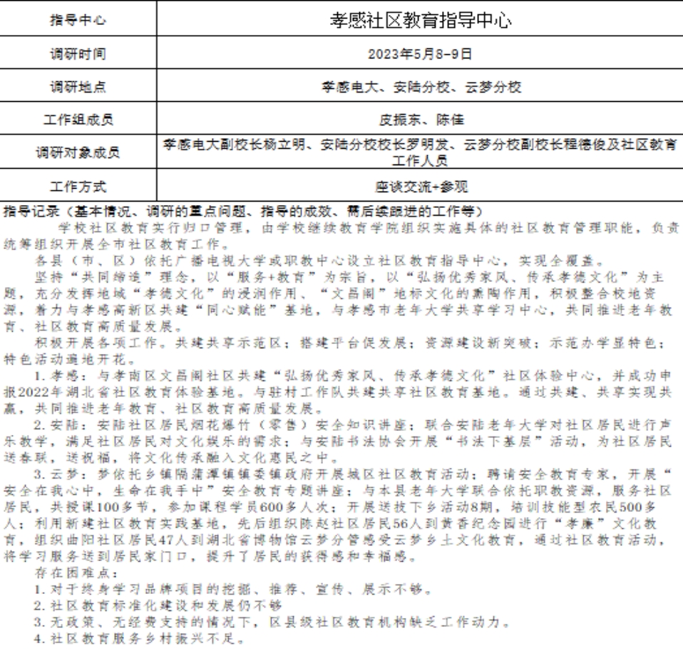 院长万婷赴宜昌、黄冈、恩施、十堰等地,就当地社区教育、老年教育开展特色进行宣传,对存在难点进行调研,并结合当地实际,给出针对性指导,联系各界共同支持社区教育高质量发展;副院长皮振东带队深入襄阳、孝感、天门、老河口、谷城等地,问需求、析难题、谋对策,结合地域特色,针对性支招解惑、指导当地打造社区教育、老年教育特色亮点品牌。